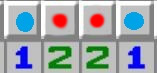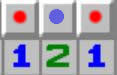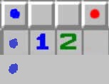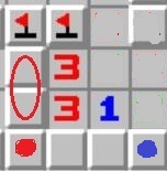 Below: According to the number 3 located at the top of the figure, if there is only one mine in the two unknown squares enclosed by the ellipse, then the number 3 below becomes 2, using the 12 formula. The blue dot is not mine, and the red dot is mine.